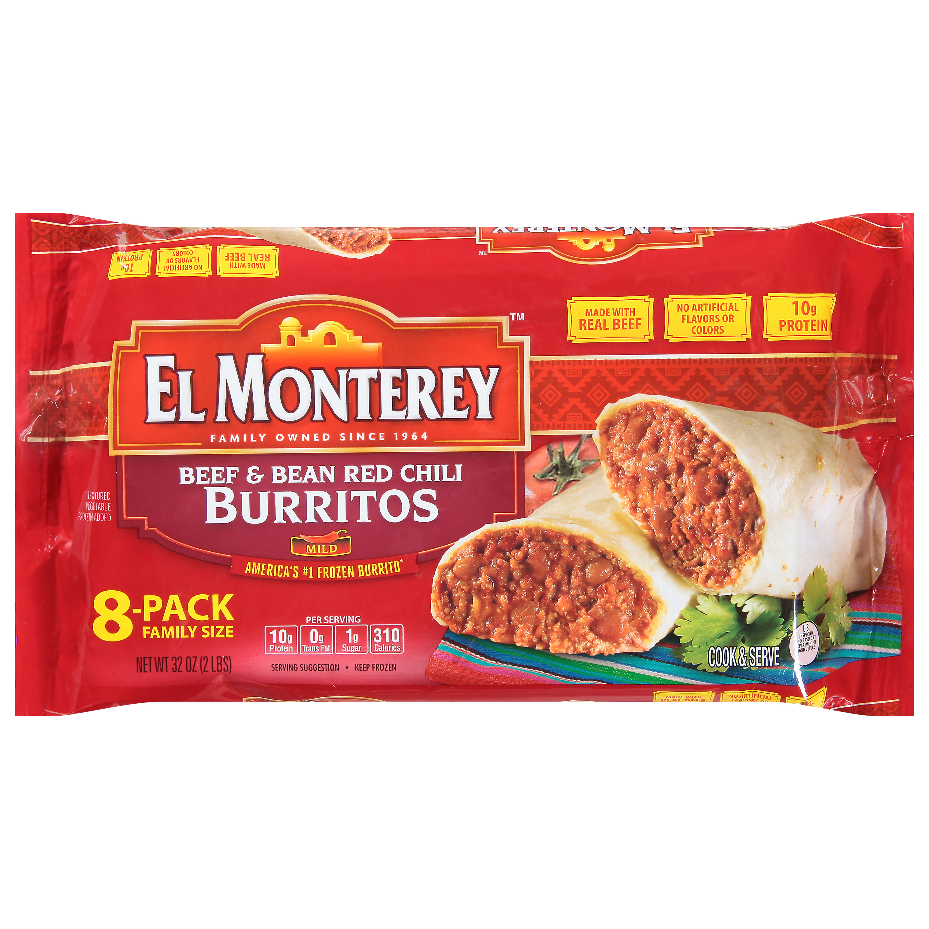 No artificial flavors or colors. 10 g protein. Per Serving: 10 g protein; o g trans fat; 1 g sugar; 310 calories. Family owned since 1964. Textured vegetable protein added. America's no.1 frozen Burrito (Source: El Monterey brand, Nielsen Scan Data, US - XAOC (All Reporting Retail Outlets Combined), Frozen Burritos $ Volume by brand, 26 weeks ending August 06, 2016). Satisfaction guaranteed 1-800-772-6474. U.S. inspected and passed by Department of Agriculture. www.elmonterey.com. Facebook.