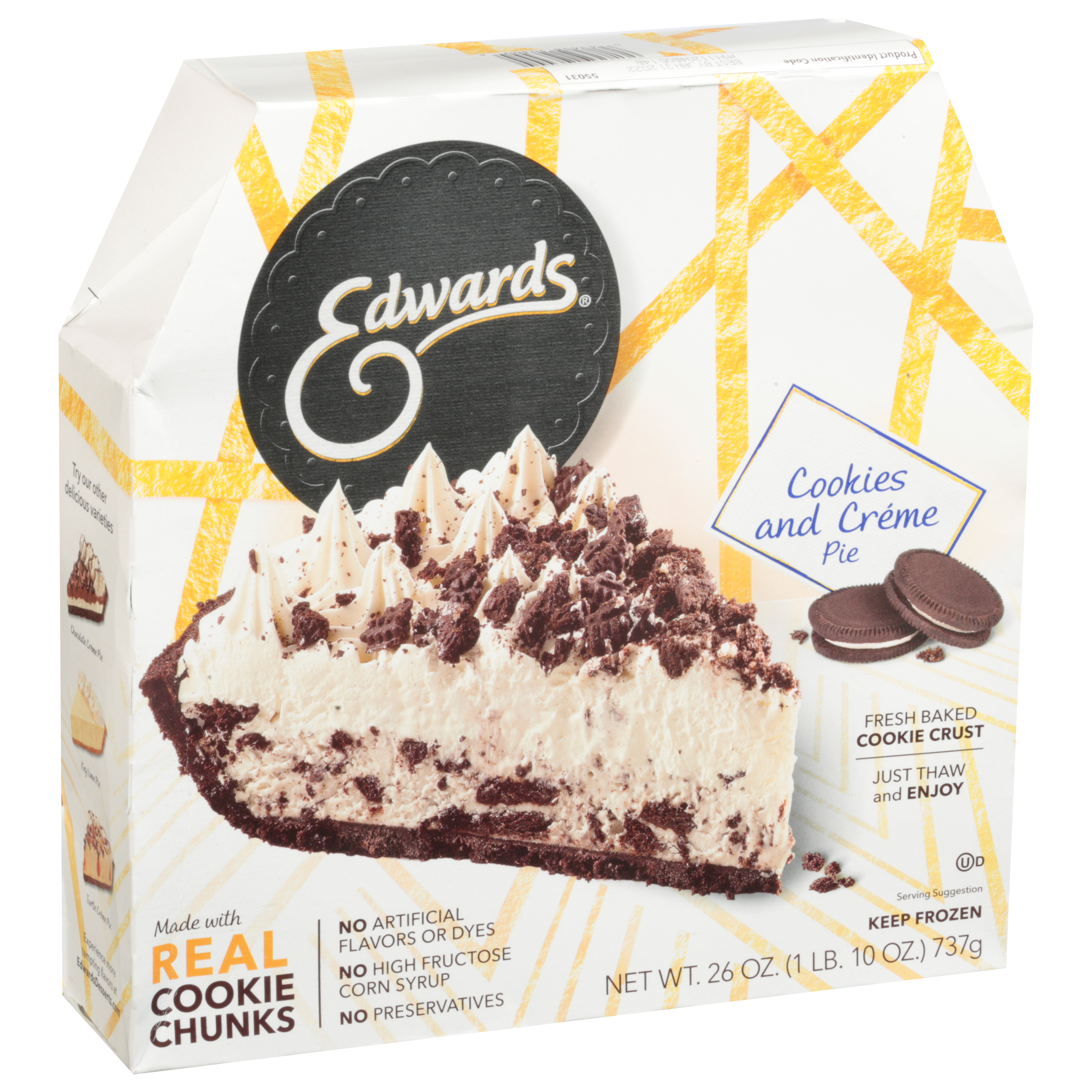 Fresh baked cookie crust. No artificial flavors or dyes. No preservatives. Just thaw and enjoy. No high fructose corn syrup. Edwards Desserts: From our decadent, velvety layers to our fresh-from-the-oven cookie crumb crusts, Edwards Desserts are meticulously whipped, toasted, sprinkled and drizzled to extravagant perfection. We even prepare, bake and crush our own cookies, because a dessert is only as good as its crust. Each delicious flavor is always the talk of the table, and as easy as one-two-thaw. Chocolate cookie crumb crust. Topped with whipped cream. Cookie crumb garnish. Smooth vanilla creme. EdwardsDesserts.com. Facebook. Instagram. Follow us on Facebook and Instagram. Dessert Lover, As the makers of Edwards Desserts, we want to hear your praise, feedback, comments, questions and ideas for future flavors. Call us directly at 1-866-RDY2-EAT (1-866-739-2328) or visit us at EdwardsDesserts.com. Experience more tempting flavors at EdwardsDesserts.com. Try our other delicious varieties. Chocolate Creme Pie. Key Lime Pie. Turtle Creme Pie. 100% recyclable. Recycling programs for this package may not exist in your area. Product of USA.