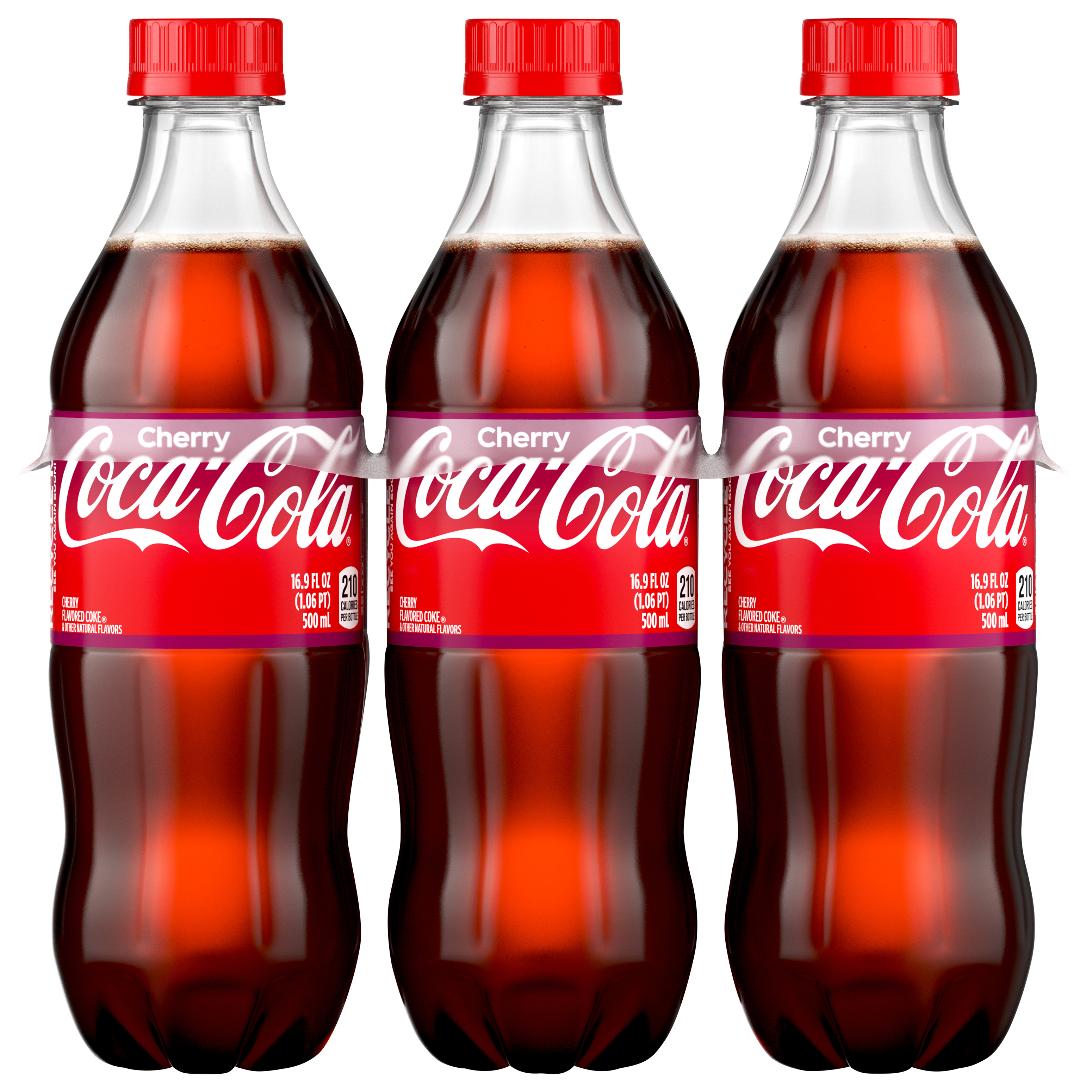 Cherry flavored Coke & other natural flavors. 210 calories per bottle. Caffeine Content: 48 mg/16.9 fl oz. coke.com. how2recycle.info. SmartLabel: Scan for info. Call 1-800-438-2653 for more food information. Recycle bottle with cap on. Recycle me. See you soon!