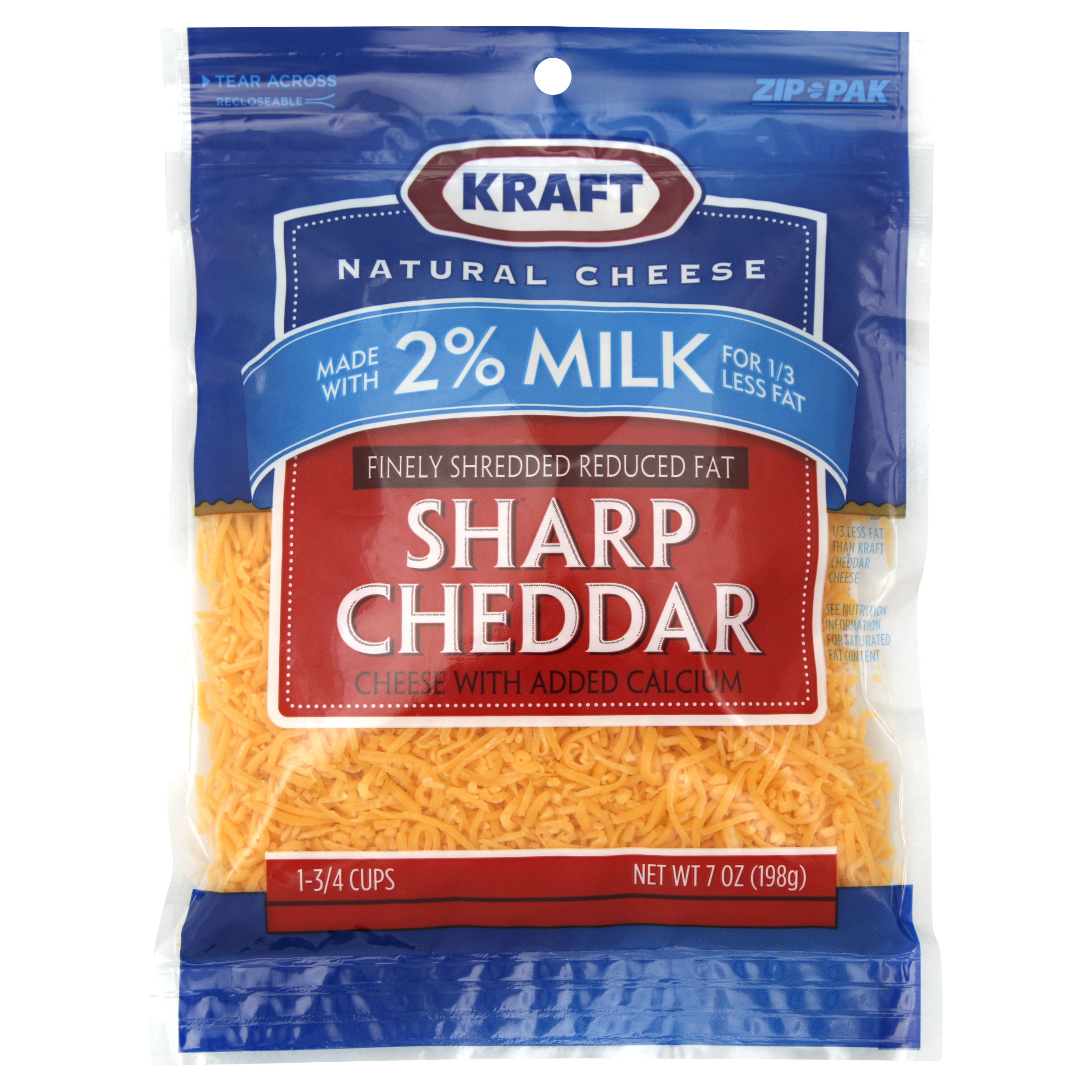 1-3/4 cups. Cheese with added calcium. Made with 2% milk for 1/3 less fat. Zip-pak. Resealable. Contains 0 g of lactose per serving. Fat reduced from 9 g to 6 g per serving. kraftfoods.com.