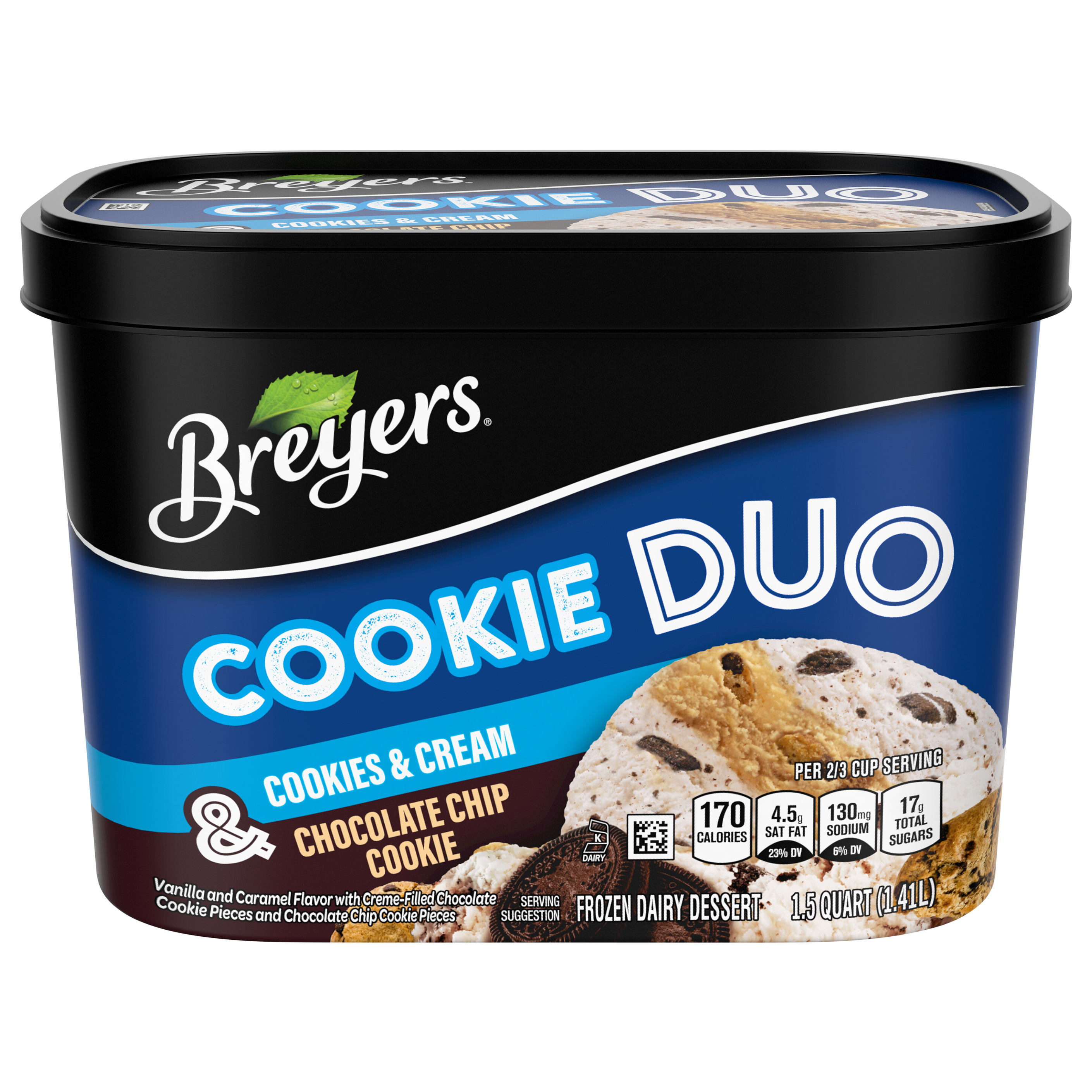 Vanilla and caramel flavor with creme-filled chocolate cookie pieces and chocolate chip cookie pieces. Per 2/3 Serving: 170 calories; 4.5 g sat fat (23% DV); 130 mg sodium (6% DV); 17 g total sugars. Contains a bioengineered food ingredient. Questions? Visit learnaboutmyfood.com. Breyers Pledge: At Breyers, we start with only high quality ingredients. Our milk and cream come from cows not treated with artificial growth hormones (Suppliers of other ingredients such as cookies, candies & sauces may not be able to make this claim. The FDA states that no significant difference has been shown between dairy derived from rBST-treated and non-rBST-treated cows). Find out more information about Breyers pledge at www.breyers.com. Our colors and flavors come from natural sources. Our vanilla and fruit are real and sustainably farmed. Quality since 1866. 100% Grade A milk and cream. www.breyers.com. learnaboutmyfood.com. App enabled. Smartlabel. Questions or comments call or visit us at 1-800-931-2826; www.breyers.com.